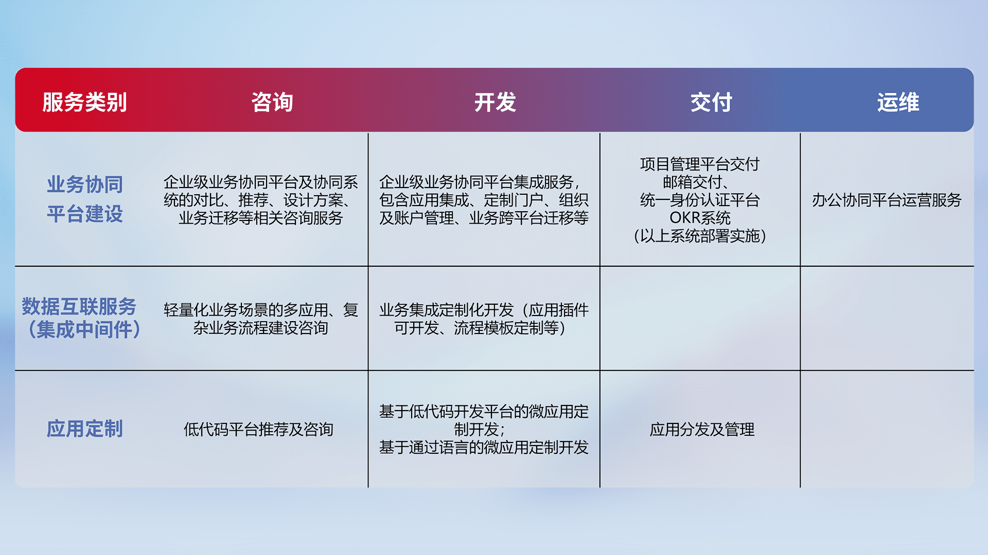 针对钉钉、、、、企微、、、、IDaas等平台级产品提供产品的规划、、、方案、、交付、、定制化开发等服务,,实现如统一协同办公、、、智能客户服务、、混合会议管理、、智能数据查询、、、等业务场景,,,,实现数字化转型。。。。
